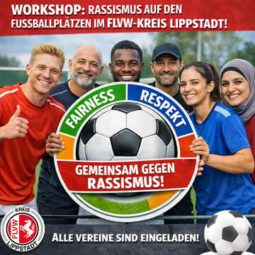 Vor dem Hintergrund von einigen rassistischen Vorfällen auf Fußballplätzen im Kreis Lippstadt in den vergangenen Monaten laden wir alle Vereine herzlich zum Workshop „Rassismus auf den Fußballplätzen im FLVW-Kreis Lippstadt“ ein.